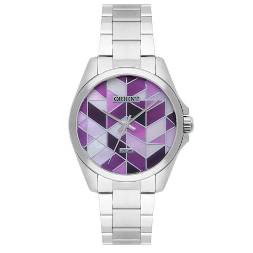 Relógio Orient Feminino FBSS0060 LRSX Quartz Gênero: Feminino Visor: Roxo Vidro: Cristal Mineral Funções: Analógico Pressão: 50M Características: com caixa Aço inoxidável e pulseira Aço inoxidável Diâmetro da caixa: 35mm Garantia: 1 ano