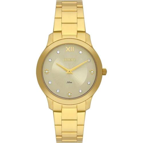 Relógio Orient Feminino Ref: Fgss0225 C3kx Casual Dourado DESCRIÇÃO DO PRODUTO: Caixa: Aço Pulseira: Aço Medida da caixa: 32MM Vidro: Cristal Mineral Alimentação do maquinário: Bateria Resistência à água: 30 m Funções: Analógico Mostrador Champanhe com Pedras e Algarismo Romano Fundo de Pressão