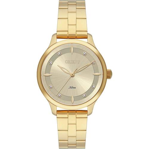 Relógio Orient Feminino Ref: Fgss0240 C1kx Casual Dourado DESCRIÇÃO DO PRODUTO: Caixa: Aço Pulseira: Aço Medida da caixa: 32MM Vidro: Cristal Mineral Alimentação do maquinário: Bateria Resistência à água: 30 m Funções: Analógico Mostrador Dourado com Pedras Fundo de 1 ano