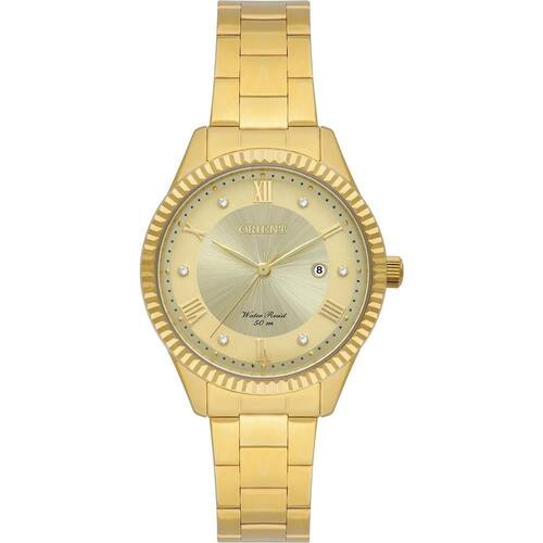 Relógio Orient Feminino Ref: Fgss1254 C3kx Casual Dourado DESCRIÇÃO DO PRODUTO: Caixa: Aço Pulseira: Aço Medida da caixa: 34MM Vidro: Cristal Mineral Alimentação do maquinário: Bateria Resistência à água: 50 m Funções: Analógico, Calendário Mostrador Champanhe com Algarismos Romanos e Pedras Fundo Rosqueado de 1 ano Marca: Não Informado