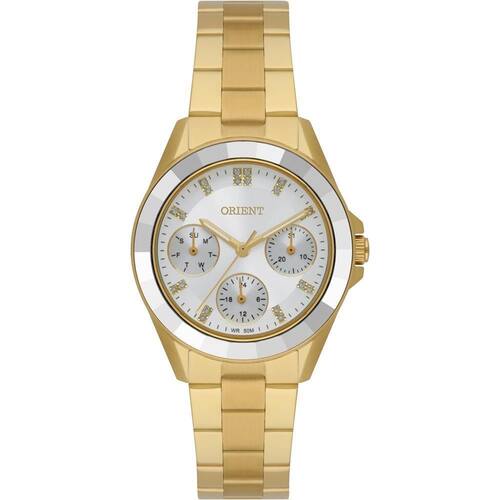 Relógio Orient Feminino Ref: Fgssm103 S1kx Multifunção Dourado DESCRIÇÃO DO PRODUTO: Caixa: Aço Pulseira: Aço Medida da caixa: 33MM Vidro: Cristal Mineral Alimentação do maquinário: Bateria Resistência à água: 50m Funções: Analógico, Multifunção Calendário Mensal, Semanal e Horário em 24h Mostrador Prateado com Pedras Aro Externo Bisotê Fixo Prateado Fundo de 1 ano Marca: Não Informado