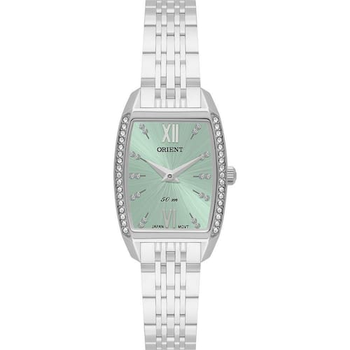 Relógio Orient Feminino Ref: Lbss0092 F3sx Retangular Prateado DESCRIÇÃO DO PRODUTO: Caixa: Aço Pulseira: Aço Medida da caixa: 21MM x 24MM Vidro: Cristal Mineral Alimentação do maquinário: Bateria Resistência à água: 50m Funções: Analógico Mostrador Verde Claro com Algarismos Romanos Aro externo com pedras Fundo Mecanismo Japonês de 1 ano Marca: Não Informado