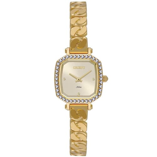 Relógio Orient Feminino Ref: Lgss0062 C1kx Retangular Dourado DESCRIÇÃO DO PRODUTO: Caixa: Aço Pulseira: Aço Medida da caixa: 21MM x 21MM Vidro: Cristal Mineral Bisotê Alimentação do maquinário: Bateria Resistência à água: 30m Funções: Analógico Mostrador Dourado Aro externo com pedras Fundo Mecanismo Japonês de 1 ano Marca: Não Informado