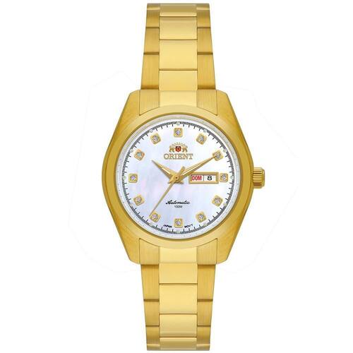 Relógio orient feminino ref: nh6gg002 b1kx dourado automático Descrição do produto: Vidro: cristal mineral Funções: automático, analógico, calendário duplo com opção em espanhol e inglês Resistência à água: 100m Características: com caixa em aço e pulseira em aço Diâmetro da caixa: 32 mm Mecanismo japonês Alimentação do maquinário: mecânico, automático Fundo rosqueado Mostrador madreperola branca com pedras de 1 ano Marca: Não Informado