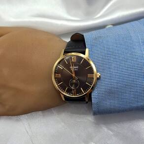 Características Formato do Relógio: Redondo Composição do Vidro: Safíra Material da Caixa: Aço Inox Cor da Caixa: Dourado Cor do mostrador: Preto Material da Pulseira: Couro Cor da Pulseira: Preto Mecanismo: Analógico Quartz