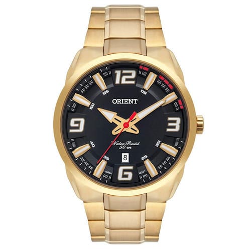 Relógio ORIENT analógico dourado preto MGSS1178 P2KX