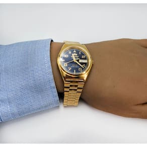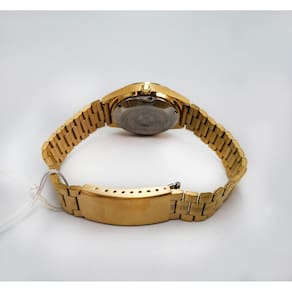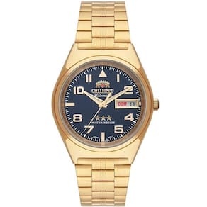 Características Formato do Relógio: Redondo Composição do Vidro: Cristal Mineral Material da Caixa: Aço Inox Cor da Caixa: Dourado Cor do mostrador: Azul Material da Pulseira: Aço Inox Cor da Pulseira: Dourado Mecanismo: Automática-Mecânica