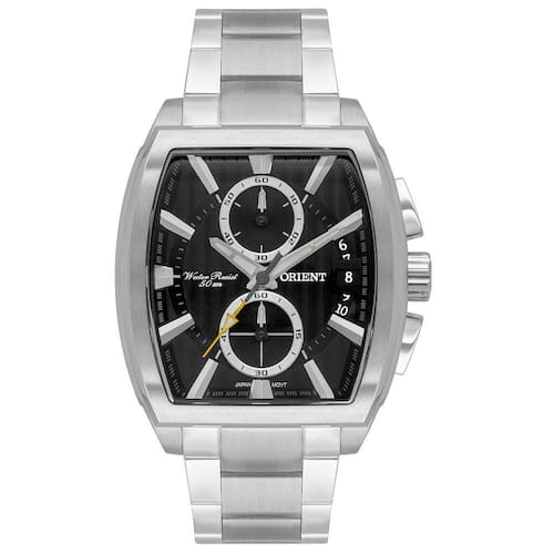 Sistema de energia: Bateria Coroa: Simples Botões: Simples Tampa posterior: Parafusada Sistema de fecho: Tipo 6 Resistência à água: 50 m Visor: Cristal Mineral Material da tampa: Aço Inoxidável Material da caixa: Aço Inoxidável Material da pulseira: Aço Inoxidável Cor do mostrador: Prata Cor da caixa: Prata Cor da pulseira: Prata Cor dos detalhes: Prata + Preto Acabamento: Escovado + Polido