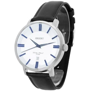 Características - Sistema de energia : Bateria - Coroa: Simples - Tampa posterior : Rosqueado - Resistência à água : 50M - Vidro : Cristal mineral - Mostrador: Prata com detalhes azul - Material da caixa : Aço - Material da pulseira : Couro Preto