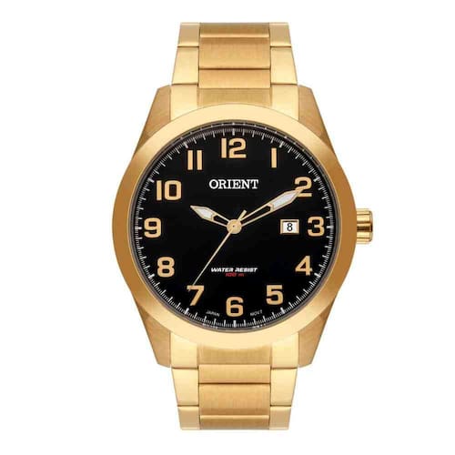 Vamos conhecer um pouco mais sobre o produto? Possui mecanismo Analógico, a pulseira é na cor Dourado, fabricada em Aço, com 26 cm de comprimento e possui Fecho Dobrável com Dois Botões. A Caixa (peça onde fica o mostrador) é fabricada em Aço, mede 4,5 cm de diâmetro, sem considerar a coroa, e 1,0 cm de espessura, o que é considerado tamanho Grande para relógios do gênero Masculino. O Relógio Orient Masculino MGSS1180P2KX tem nível de resistência à água especificado em 10 ATM. Com relação as funções adicionais do relógio: possui Calendário Analógico com Data e Marcadores com Illuminator.
