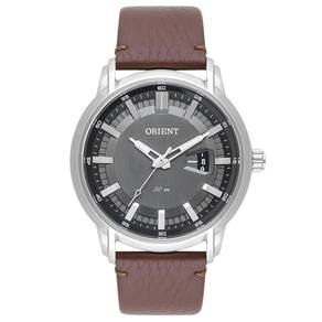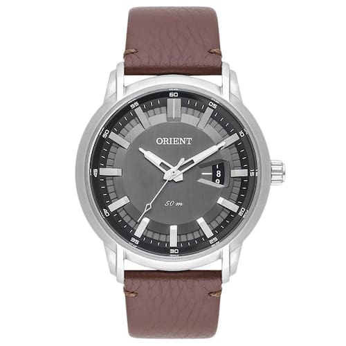 Relógio Orient Masculino Prata Analógico MBSC1039 G1NX Relógio Orient masculino da linha Eternal. Caixa de aço e pulseira de couro marrom. Visor cinza, detalhes prateados e função data. Tamanho grande 4,4 cm .