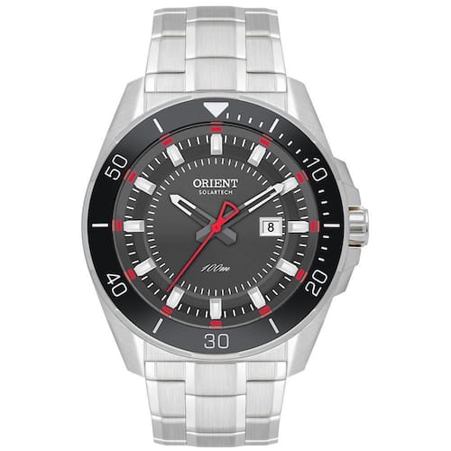 Vidro: cristal mineral Funções: calendario, analógico, solar Resistencia à água: 100 m Características: com caixa aço inoxidável e pulseira aço inoxidável Diâmetro da caixa: 4,5 cm Alimentação do maquinário: energia solar Mostrador grafite com detalhes em vermelho Aro fixo preto Fundo rosqueado Linha: orient solartech
