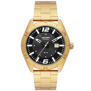 Relógio orient masculino ref: mgss1289 g2kx solar dourado Descrição do produto: Vidro: cristal mineral Funções: calendario, analógico, solar Resistencia à água: 50 m Características: com caixa aço inoxidável e pulseira aço inoxidável Diâmetro da caixa: 4,2 cm Alimentação do maquinário: energia solar Mostrador grafite com números e detalhes em preto Fundo rosqueado Linha: orient solartech de 1 ano