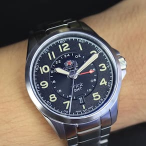 funções: Automático, Analógico, Calendário Mensal, Hacking (Ponteiro de segundos para no modo de acerto de horas), Enrolamento manual (Premite dar corda diretamente na coroa), Reserva de Marcha de 40h, GMT