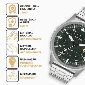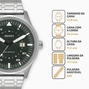 Marca: orient Referência: MBSS1487E1SX Modelo: solartech Ficha Técnica: Formato da caixa: Redondo Gênero: Masculino Cor: Prata Cor do mostrador: Verde Material da Pulseira: aço inoxídavel Material da Caixa: Aço inoxidável Mostrador: Analógico Mecanismo: Solartech Nivel de Resistência à Agua: 5 ATM 50 metros Material do Vidro: Cristal Mineral Tipo de Fecho: Dobrável com botao Tipo de Coroa: Botão padrão Fundo: Rosqueado Medidas: Pulseira Ajustável: Sim Tamanho da Caixa: 41,9 mm Altura da Caixa: 11,2 mm Dimensões da Caixa com a Coroa: 44,9 mm Largura da Pulseira: 17,7 mm Itens Inclusos: Funções: - Solartech com autonomia de 4 meses - Calendário com dia do mês - Mostrador texturizado - Precisão: 15 segundos por mês - Index e ponteiros de hora e minutos com luminosidade de 12 meses para todo o Brasil. Marca: Não Informado