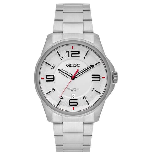 Máquina movida a bateria / quartz Mecanismo Analógico com 3 ponteiros Caixa do relógio em aço inoxidável prateado Pulseira de aço inoxidável prateado Fecho com botões laterais de pressão para abertura Mostrador Branco Vidro de Cristal Mineral Relógio com calendário dia do mês Coroa simples de pressão padrão sem rosca Tampa posterior rosqueada Resistência à água 5ATM (50M)