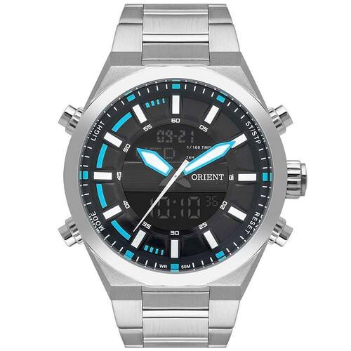cronógrafo, anadigi gênero: masculino visor: 3d na cor cinza com detalhes em azul vidro: cristal mineral funções: calendário, timer, alarme, dual time pressão: 50m características: com caixa em aço e pulseira em aço diâmetro da caixa sem coroa : 45mm diâmetro da caixa com coroa : 50mm altura da caixa :15mm peso: 180g acompanha: ,caixa