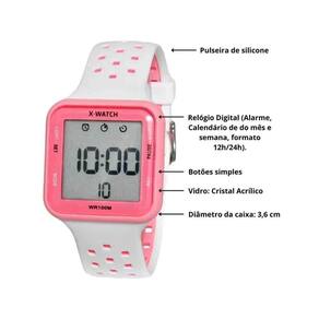 Estamos há mais de 50 anos no mercado oferecendo uma ampla variedade de acessórios, incluindo relógios e óculos de sol, com as melhores marcas e estilos. Além disso, a nossa equipe é treinada para oferecer um atendimento excepcional, garantindo que cada cliente seja tratado com o respeito e a atenção que merece.Realizando a compra, não deixe de nos avaliar Sua opinião é muito importante para aperfeiçoar cada vez mais o nosso trabalho.ESPECIFICAÇÕES TÉCNICAS- Marca: X-Watch- Referência:XGPPD197- Gênero: Feminino- Tipo de mostrador: Digital- Tipo de movimento: Quartz- Tipo de fecho: Fivela- Cor da caixa: Rosa- Cor do mostrador: LCD Positivo- Cor da pulseira: Branca por fora e Rosa por dentro- Material da caixa: Policarbonato- Material da pulseira:Silicone- Largura da caixa:3,6 cm - Espessura da caixa:1,5 cm - Largura da pulseira:2,2 cm - Resistência à água:10 ATM 10M - : 1 ano Marca: Não Informado