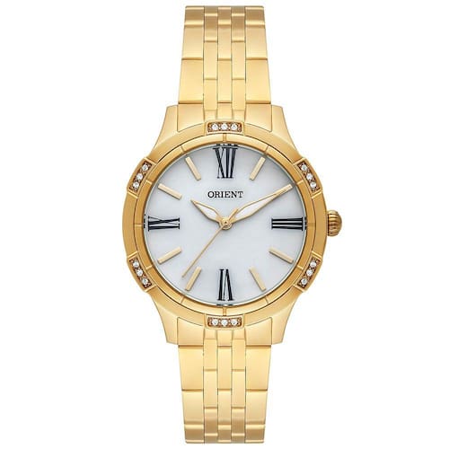 Analógico Gênero: Feminino Visor: Madrepérola Vidro: Cristal mineral Funções: CRISTAIS DE ALTA QUALIDADE Pressão: 50m Características: com caixa em aço + IPG e pulseira em aço + IPG Diâmetro da caixa: 34,5mm