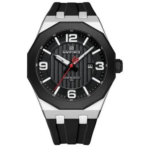 Especificações: [Funcionalidade Impressionante] Além de estilo, o relógio Naviforce oferece recursos como resistência a choques, mãos luminosas e um calendário completo, que exibe automaticamente os dias da semana e data.[Construção Durável] O estojo do relógio é feito de liga, enquanto a face de visualização é protegida por Hardlex, garantindo assim que o seu relógio suporte o uso diário sem danos.[Estilo Contemporâneo] Com estilo que vai de fashion a casual, este modelo se adapta a qualquer ocasião, seja para um evento elegante ou um passeio relaxante. Ele certamente será o destaque do seu look.[Resistência à Água] Com profundidade de resistência à água de 3ATM, você pode usar o relógio tranquilamente em ambientes úmidos sem se preocupar.[Conforto Maximizado] A pulseira de silicone oferece um toque suave no pulso, proporcionando conforto superior ao longo do dia e a largura da banda de 25mm a 29mm para ajuste perfeito.