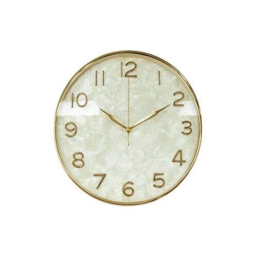 Tamanho: 37 cm de diâmetro Formato: Redondo clássico Acabamento: Borda dourada metálica com brilho refinado Mostrador: Textura madrepérola que reflete a luz com suavidade Números: Grandes, dourados e de fácil leitura Estilo: Luxuoso e versátil combina com salas, escritórios, quartos e ambientes sofisticados