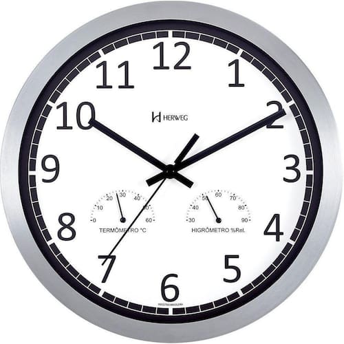 Relógio Parede Herweg alumínio com termômetro e higrômetro Características do produto -moldura em alumínio escovado -fundo: Branco -vidro: Mineral -funções: Termômetro e Higrômetro analógicos -diâmetro: 30,5 cm -peso aproximado: 1000g -garantia Herweg: 1 ano