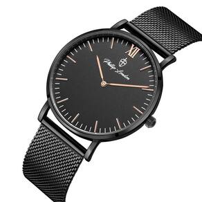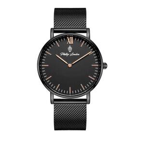 DESCRIÇÃO DO PRODUTO: Caixa de Metal Pulseira de Malha de Aço Mesh Vidro de Cristal Mineral Fundo Rosqueado Resistente à Água 5 Atm Diâmetro / Largura da Caixa: 40.00 MM Funções: Analógico Design Inglês Estilo: Esporte Fino Alimentação do Maquinário: Bateria Linha: Philiph London Greenwich Mostrador Preto com detalhes em rosé e algarismo romano Garantia de 1 ano Marca: Phillip London