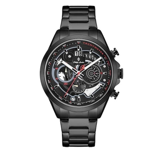 Relógio Phillip London Masculino Ref: Pl80388613m Pr N Cronógrafo Black DESCRIÇÃO DO PRODUTO: Caixa de Metal Pulseira de Aço Vidro de Cristal Mineral Fundo Rosqueado Resistente à Água 5 Atm Diâmetro / Largura da Caixa: 45.00 MM Funções: Analógico, Cronógrafo, Calendário Design Inglês Estilo: Esporte Fino Mostrador Preto com detalhes em vermelho Alimentação do Maquinário: Bateria Garantia de 1 ano Marca: Phillip London