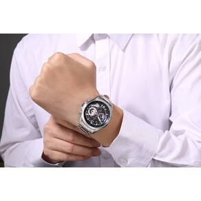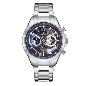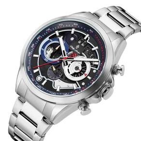 Relógio Phillip London Masculino Ref: Pl80389623m Az N Cronógrafo Prateado DESCRIÇÃO DO PRODUTO: Caixa de Metal Pulseira de Aço Vidro de Cristal Mineral Fundo Rosqueado Resistente à Água 5 Atm Diâmetro / Largura da Caixa: 45.00 MM Funções: Analógico, Cronógrafo, Calendário Design Inglês Estilo: Esporte Fino Mostrador Azul com detalhes em vermelho Alimentação do Maquinário: Bateria de 1 ano Marca: Não Informado