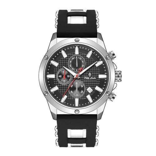 Relógio Phillip London Masculino Ref: Pl80390629m Pr N Cronógrafo Prateado DESCRIÇÃO DO PRODUTO: Caixa de Metal Pulseira de Silicone Preta Vidro de Cristal Mineral Fundo Rosqueado Resistente à Água 5 Atm Diâmetro / Largura da Caixa: 45.00 MM Funções: Analógico, Cronógrafo, Calendário Design Inglês Estilo: Esporte Fino Linha: Phillip London Falcon Mostrador Preto com detalhes em prateado Alimentação do Maquinário: Bateria Garantia de 1 ano Marca: Phillip London Ean: 7897033052921
