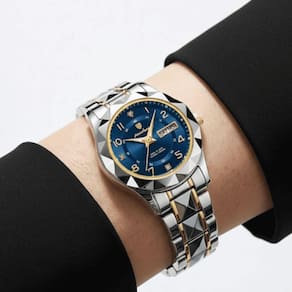 A combinação de aço inoxidável em dois tons (prata e dourado) garante resistência, conforto e um visual que nunca sai de moda.