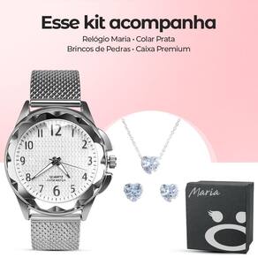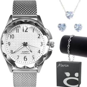 Relogio prata feminino prova dagua pulseira + brinco colar ajustavel prateado moda silicone casual arrase com o Kit Feminino Orizom Maria - Relógio, Colar, Pulseira e Caixa Premium