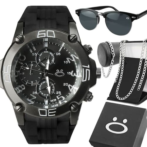 Kit de Acessórios Masculinos Orizom Spaceman - Relógio, Óculos de Sol, Cordão, Pulseira e Caixa PremiumO Kit Orizom Spaceman é a escolha perfeita para homens que buscam estilo e exclusividade. Com acabamento premium e design sofisticado, este conjunto é ideal para presentear ou complementar o visual com elegância. O kit inclui:- Relógio masculino analógico Orizom modelo Spaceman, com maquinário em aço inoxidável e pintura eletrostática preta (black piano). Seu design redondo e mostrador preto, assim como a pulseira ajustável em silicone preto, o tornam adequado para qualquer dimensão de pulso. A tampa blindada traz uma arte exclusiva da linha Spaceman, comprovando autenticidade e exclusividade.- Óculos de sol Orizom modelo Spaceman vintage, em formato oval e totalmente preto, com armação e hastes em acetato. Seus detalhes de metal na parte inferior acrescentam um toque de sofisticação ao design, enquanto as lentes com proteção UV garantem segurança.- Cordão Grumet em aço inox prata, com aproximadamente 65 cm, ideal para um visual moderno e clássico.- Pulseira combinando com o cordão Grumet, também em aço inox prata, com cerca de 25 cm, completando o conjunto com harmonia e estilo.- Caixa ultra premium Orizom modelo Spaceman, projetada para guardar o relógio e os acessórios com segurança e organização, sendo uma excelente opção para presente.O Kit Orizom Spaceman combina acessórios de alta qualidade e design refinado, sendo a escolha ideal para quem valoriza autenticidade, durabilidade e bom gosto. Adquira já o seu e eleve o seu estilo!