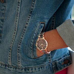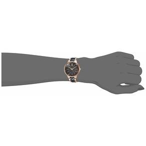 Relógio feminino com pulseira de resina Anne Klein — Lente de cristal mineral levemente abobadada — Mostrador cinza em madrepérola com ponteiros e marcadores em tom de ouro rosa e cinza perolado — Pulseira de elos ajustáveis em resina cinza perolado; fecho e extensor de joias — Resistente à água até 30 m (99 pés)