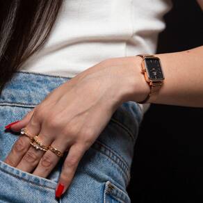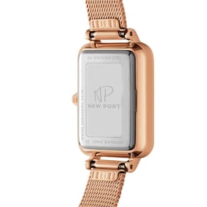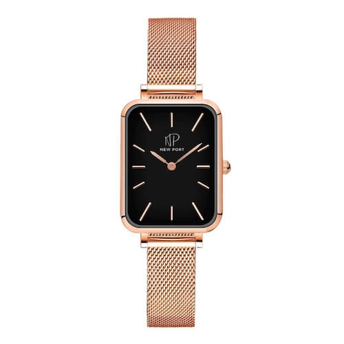 O Relógio Feminino New Port Quadrado Vermont, com sua pulseira de aço inoxidável rosé, apresenta dimensões de 20x26mm. A caixa é fabricada em metal rosé, contrastando elegantemente com o mostrador preto, protegida por um vidro de mineral resistente.