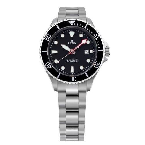 Relógio feminino Ratio FreeDiver Sapphire em aço inoxidável com mostrador preto de quartzo RTFL800 200M