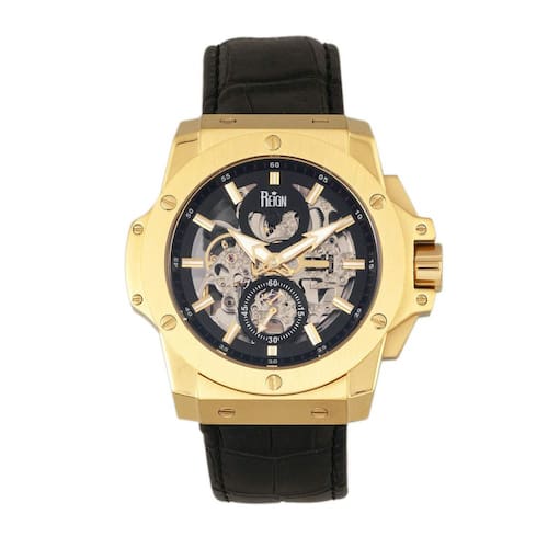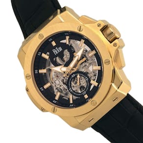 Mostrador preto (centro esqueleto) aprimorado por ponteiros luminosos dourados. Caixa de aço inoxidável dourada com uma pulseira de couro preto. Movimento automático. Resistência à água até 50 metros. Bisel fixo. Cristal mineral resistente a riscos. Parte traseira transparente. Fecho tang. Coroa de puxar/empurrar. Tamanho da caixa: 48 mm x 13 mm. Faixa de 24 mm x comprimento. Relógio Commodus Reign REIRN4004.
