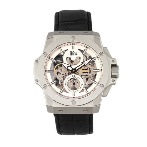 Mostrador prateado (esqueleto central) aprimorado por ponteiros luminosos prateados. Caixa de aço inoxidável prateado com pulseira de couro preto. Movimento automático. Resistência à água até 50 metros. Bisel fixo. Cristal mineral resistente a arranhões. Parte traseira transparente. Fecho de pino. Tamanho da caixa: 48 mm x 13 mm. Pulseira de 24 mm x de comprimento. Relógio Commodus Reign REIRN4001.