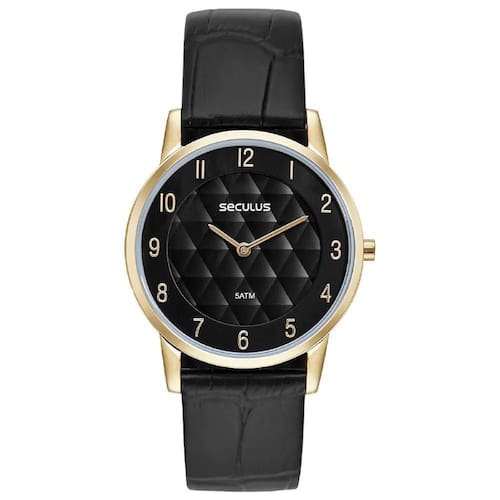 Mecanismo: Quartzo Gênero: Masculino Visor: Preto Vidro: cristal mineral Funções: Hora e Minuto Prova d'água: 50m Características: com caixa em aço dourado e pulseira em couro preto Diâmetro da caixa: 38mm Garantia: 2 anos pelo fabricante Seculus