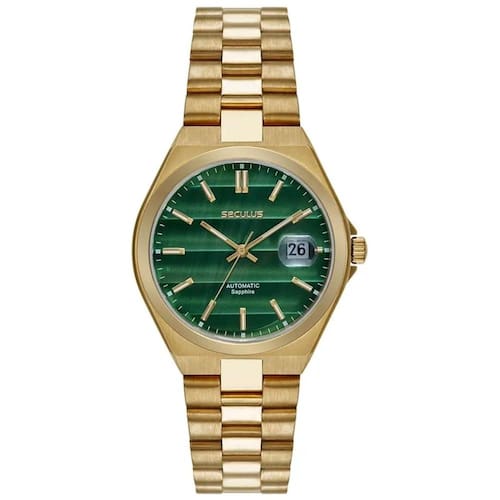 Relógio seculus automático 77313gpsvda4 Relógio automático com 21 joias e reserva de carga de 42h, construido todo em aço inoxidável, traz elegância e funcionalidade em um só acessório. Equipado com função calendário com luneta, oferece praticidade para o dia a dia. O fundo em vidro permite uma visualização do movimento interno, destacando a engenharia de precisão. O mostrador verde com efeito adiciona um toque contemporâneo ao design, complementado por uma caixa mediana de 40mm de diâmetro. A pulseira sólida com fecho borboleta garante conforto e um ajuste perfeito para todos os tamanhos de pulso. Este relógio é uma escolha indispensável para quem valoriza estilo e performance em um único acessório. Especificações técnicas Mecanismo: automático movimento miyota cal. 8215 - 21 joias reserva de carga de 42h Gênero: masculino Visor: verde com efeito Vidro: safira Funções: calendário com lupa Prova d'água: 50m Características: com caixa e pulseira em aço inoxidável, fecho borboleta e case back transparente. Diâmetro da caixa: 40 mm : 2 anos pela fabricante seculus