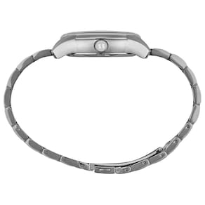 A caixa em aço inoxidável na cor prata possui 41 mm e apresenta construção robusta e bem equilibrada. A pulseira sólida em aço, com elos clássicos, complementa o visual técnico e estruturado, garantindo conforto e segurança no uso diário.