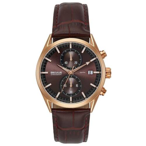 Mecanismo: Quartzo Gênero: Masculino Visor: Marrom Vidro: cristal mineral Funções: calendário e cronográfo Prova d'água: 100m Características: com caixa em aço e pulseira em couro Diâmetro da caixa: 40 mm Garantia: 2 anos pelo fabricante Seculus