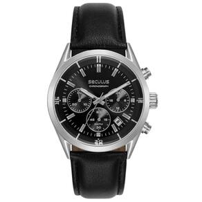 Mecanismo: Quartzo Gênero: Masculino Visor: Preto Vidro: cristal mineral Funções: calendário e cronógrafo Prova d'água: 100m Características: com caixa em aço e pulseira em couro Diâmetro da caixa: 40 mm Garantia: 2 anos pelo fabricante Seculus