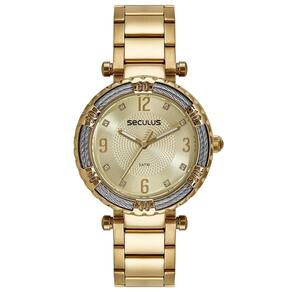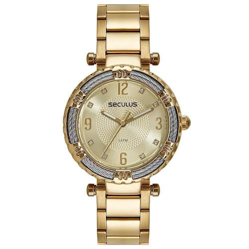 O Relógio Seculus 44236LPSVDS1 combina sofisticação e modernidade em um design exclusivo. Com caixa de 36 mm em aço dourado, este modelo se destaca pelo aro texturizado que mistura detalhes prateados em formato de cabos metálicos, conferindo um charme contemporâneo e elegante à peça.