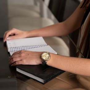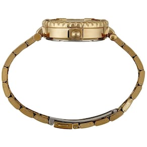 O mostrador dourado traz efeito geométrico no centro e marcadores de hora com cristais aplicados, reforçando a feminilidade e o requinte do relógio. A pulseira em aço inox dourado completa o visual sofisticado, ideal para mulheres que desejam um acessório versátil, capaz de transitar entre ocasiões casuais e formais.