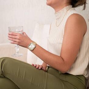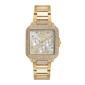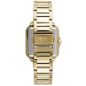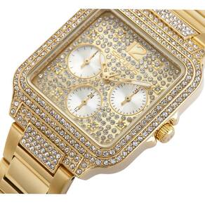 O mostrador dourado decorado com cristais conta ainda com três subdials decorativos, que reforçam o design moderno e sofisticado. A pulseira em aço inoxidável dourado completa o estilo imponente, garantindo durabilidade e conforto no uso.