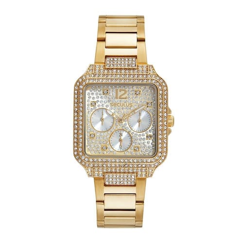 O Relógio Seculus 77232LPSVDS1 é sinônimo de luxo e sofisticação, perfeito para mulheres que desejam um acessório marcante e glamouroso. Sua caixa quadrada em aço dourado com 35 x 48 mm é totalmente cravejada por cristais, incluindo aro, mostrador e até o elo superior da pulseira, proporcionando brilho intenso em todos os ângulos.