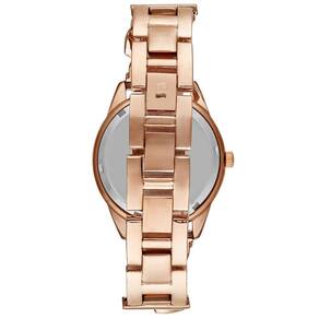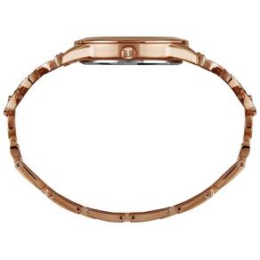 A pulseira em aço rosé, trabalhada em padrão entrelaçado e com aplicações de cristais, completa o charme do modelo, tornando-o perfeito para mulheres que buscam um acessório refinado e glamoroso. Com resistência à água de 5 ATM, é ideal para acompanhar tanto a rotina quanto momentos especiais.