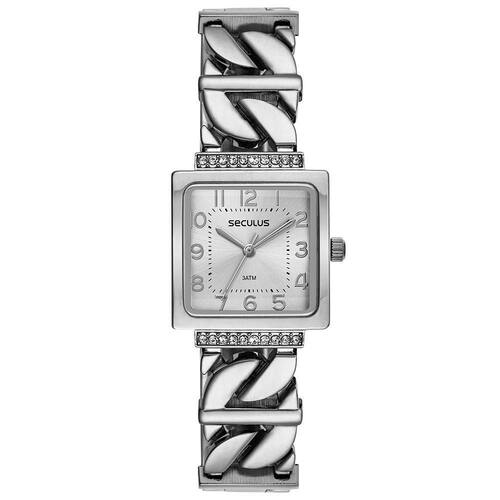 O Relógio Seculus 77297L0SVNB2 é um modelo sofisticado e elegante, ideal para mulheres que apreciam design diferenciado. Sua caixa quadrada em aço prateado de 26 x 26 mm traz um visual moderno e marcante, complementado pelo mostrador prata com marcadores numéricos e acabamento sunray.