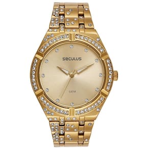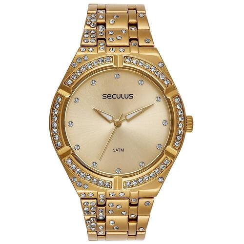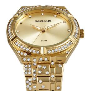 O Relógio Seculus 77306LPSVDB1 é um modelo sofisticado que une luxo e presença. Sua caixa em aço dourado de 40 mm se destaca pelo aro cravejado em cristais, que traz brilho e elegância ao acessório.